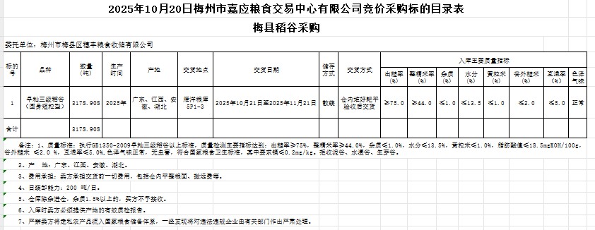 受客户委托,梅州市嘉应粮食交易中心有限公司定于2025年10月20日(星期一)举办粮食竞价交易会。梅州市梅县区穗丰粮食收储有限公司拟采购2025年产早籼稻谷3178.908吨。