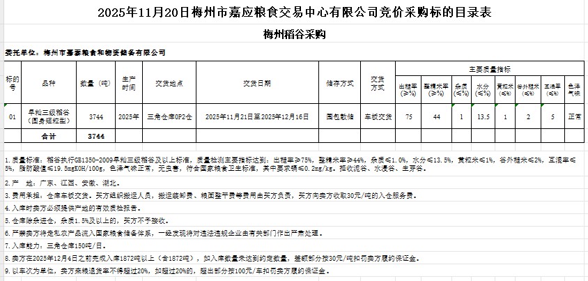 受客户委托,梅州市嘉应粮食交易中心有限公司定于2025年11月20日(星期四)举办粮食竞价交易会。梅州市嘉泰粮食和物资储备有限公司拟采购2025年产早籼稻谷3744吨。