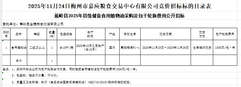 受蕉岭县金穗粮食收储有限公司委托,梅州市嘉应粮食交易中心有限公司定于2025年11月24日(星期一)上午10:00在广东省梅州市彬芳大道南161号梅州市粮食交易中心3楼,举办蕉岭县2025年县级储备食用植物油采购及包干轮换费用公开招标。