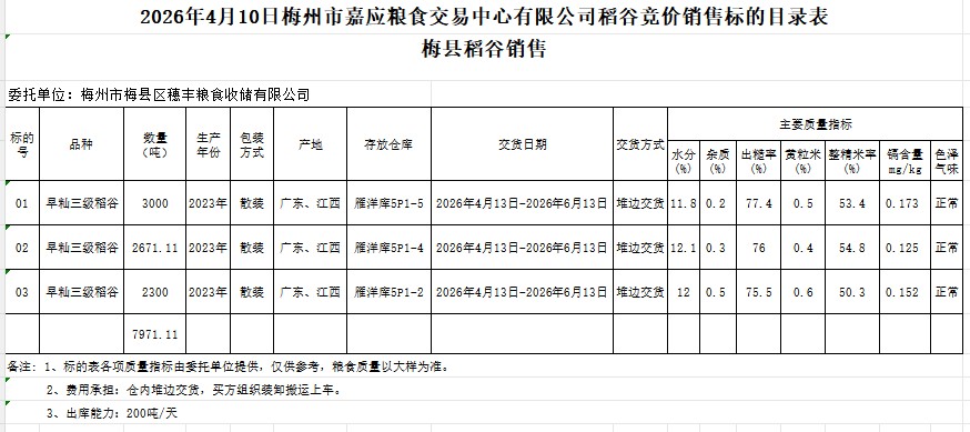 受客户委托,梅州市嘉应粮食交易中心有限公司定于2026年4月10日(星期五)举办粮食竞价交易会。梅州市梅县区穗丰粮食收储有限公司拟销售2023年产早籼稻谷7971.11吨。