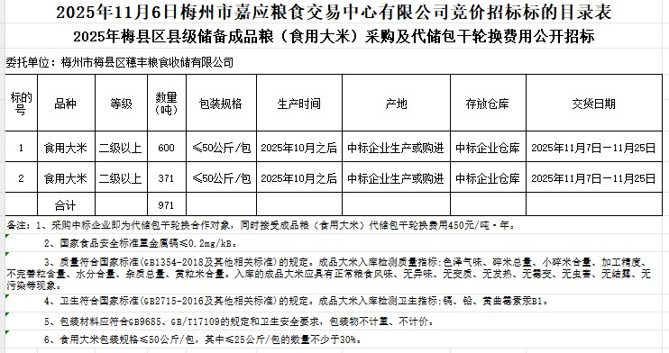 梅县区2025年县级储备成品粮(食用大米)采购及代储包干轮换费用公开招标公告