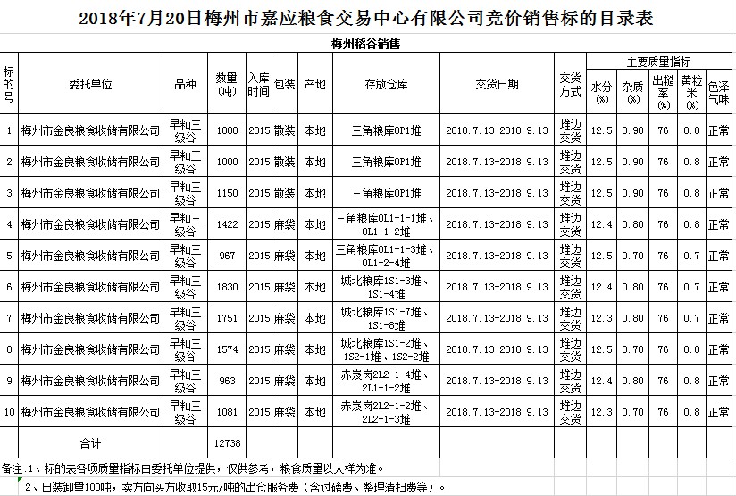 受客户委托,梅州市嘉应粮食交易中心有限公司定于2018年7月20日(星期五)举办粮食竞价交易会,梅州市金良粮食收储有限公司拟销售早籼稻12738吨。